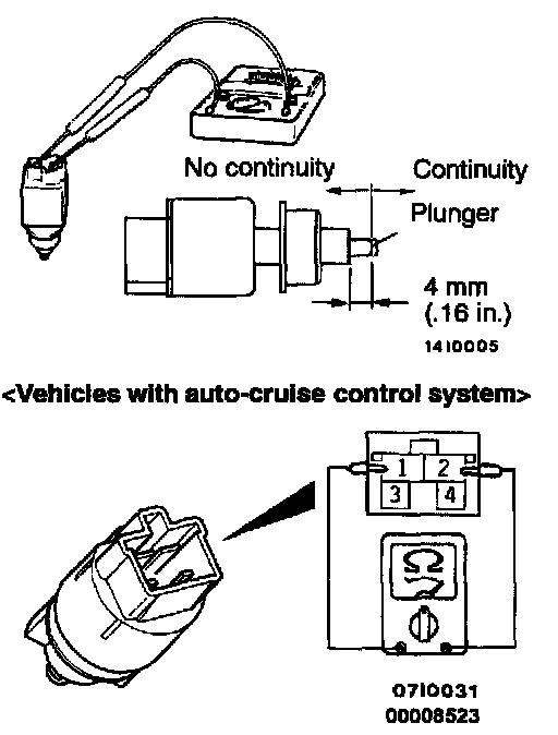 STOP LIGHT SWITCH CHECKConnect a circuit tester to the stop light switch, and check whether or not there is continuity when the plunger of the stop light switch is pushed in and when it is released. The stop light switch is in good condition if there is no continuity when the plunger is pushed in to a depth of within 4 mm (0.16 inch) from the outer case edge surface, and if there is continuity when it is released. For vehicles with auto-cruise control system, the check for continuity should be made at connectors "1" and "2" of the stop light switch.