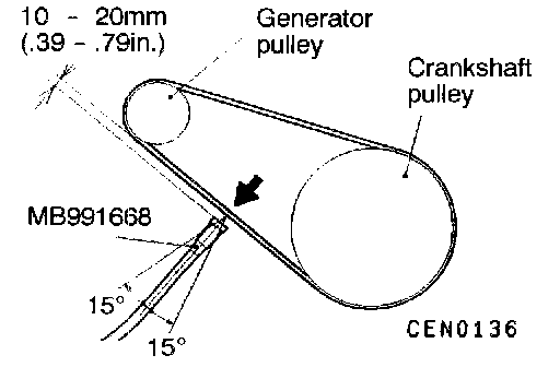 4. Hold the microphone (MB991668) to the middle of the drive belt between the pulleys (at the place indicated by the arrow), about 10 - 20 mm (0.39 - 0.79 inch) away from the rear surface of the belt and so that it is perpendicular to the belt (within an inclination of ± 15°).
