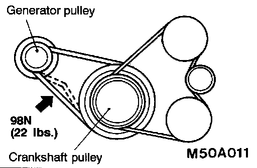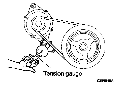 1. Check the belt tension with the tension gauge, or check the belt deflection by pressing the middle point of the belt by a force of 98 N (22 lbs.).