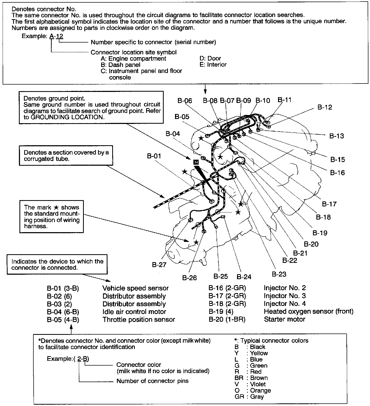 The Wiring harness diagrams clearly show the connector locations and harness routings at each site on actual vehicles.