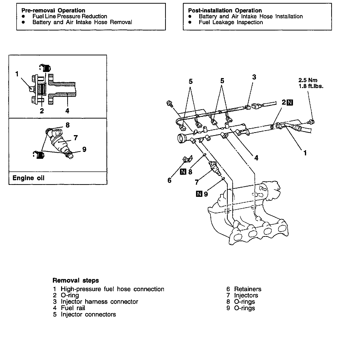 CAUTION: Do not let the engine oil get into the fuel rail.