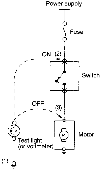 1. Ground one lead wire of the test light. If a voltmeter is used instead of the test light, ground the grounding side lead wire.