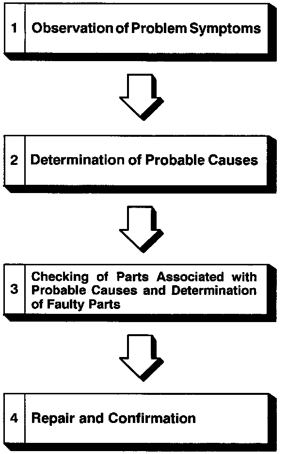 If an attempt is made to solve a problem without going through correct steps for troubleshooting, the problem symptoms could become more complicated, resulting in failure to determine the causes correctly and making incorrect repairs. The four steps below should be followed in troubleshooting.