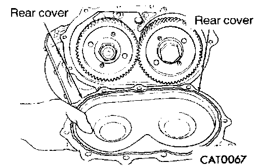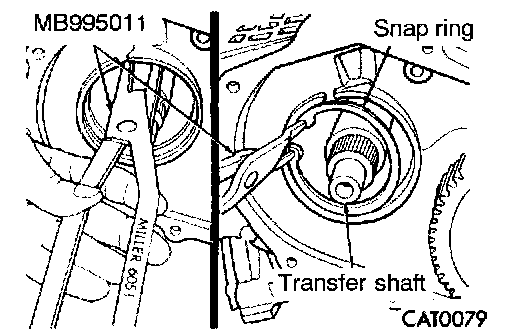 45. Remove transfer shaft bearing snap ring with Snap Ring Pliers MB995008.
