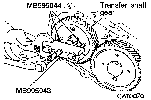 40. Install Gear Puller MB995043 and Bolts MB995044 to transfer shaft gear. Using the appropriate wrench, turn the center bolt clockwise to remove gear.