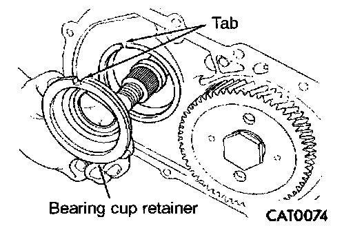 69. Remove output bearing outer cup with Bearing Cup Remover MB995011.