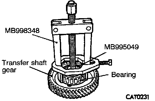 43. Install Bearing Puller MD998348 and Button MB995049 on transfer shaft gear bearing to remove bearing.
