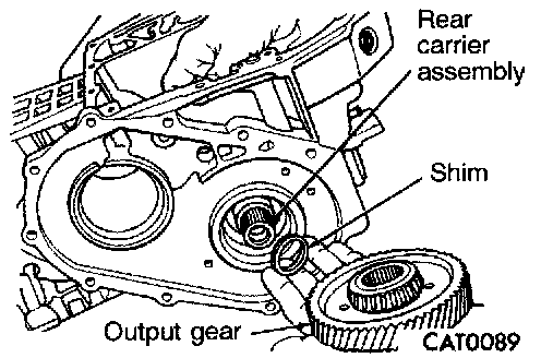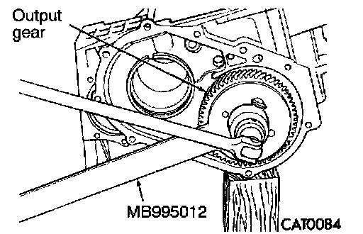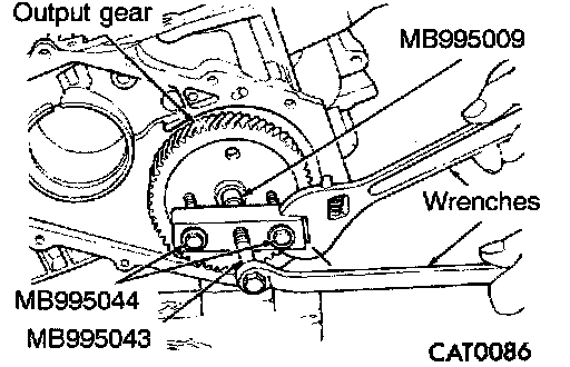 51. Install Gear Puller MB995043 with Bolts MB995044 and Thrust Button MB995009 to output gear. Turn puller center bolt clockwise to remove gear.
