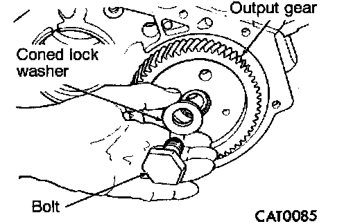 49. While holding output gear with Holder MB995012, loosen output gear bolt.