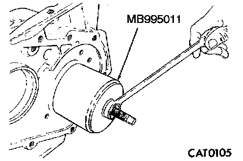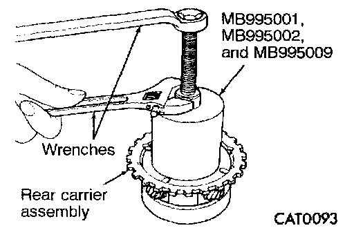 55. Remove gear carrier bearing with Bearing Puller MB995001 and MB995002 and Thrust Button MB995009.