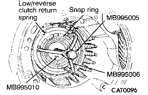 57. Install compressor tool to transaxle as shown. Compress low/reverse piston assembly. Position Spring Compressor MB995005 to allow access to snap ring.