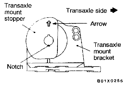 Align the notches on the stopper with the transaxle mount bracket with the arrow mark facing toward the shown direction Then install the stopper.