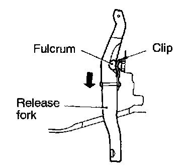 Slide release fork in direction of arrow and disengage fulcrum from clip to remove release fork. Be careful not to cause damage to clip by pushing release fork in the direction other than that of arrow and removing it with force.