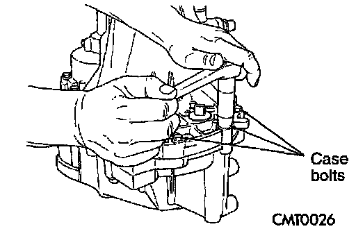 2. Remove shift levers. Remove transaxle case half bolts.