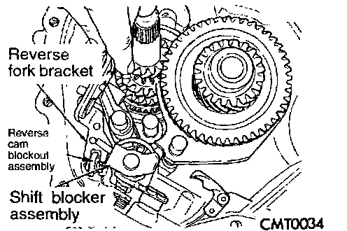 Remove reverse fork bracket and reverse cam blackout assembly.