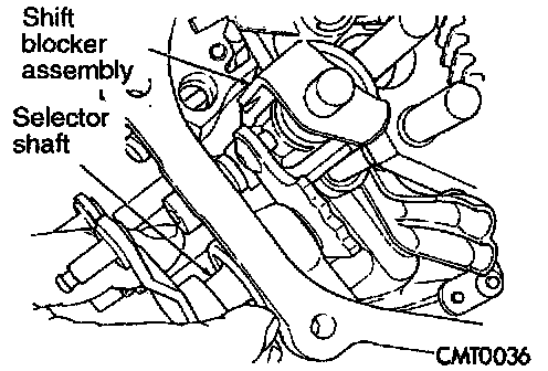 10. Pull the selector shaft shift pin out of the slot in the blocker assembly. Turn selector shaft up and out of the way.