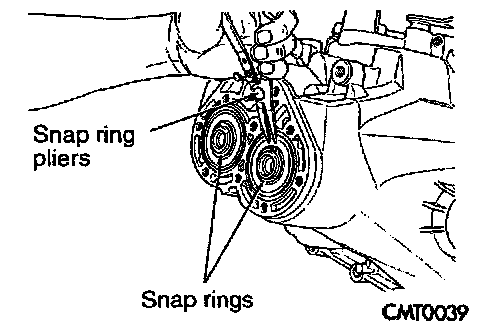 12. Remove two snap rings retaining the output shaft and the input shaft to the bearing.