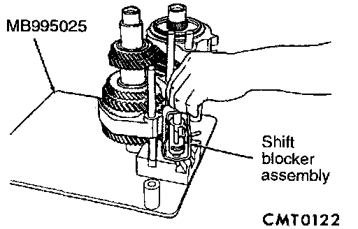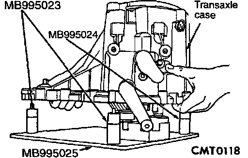13. Using bench fixture and shims provided (MB995023, MB995024, MB995025), turn transaxle over. Install transaxle onto bench fixture. Verify shim spacers are in position on bench fixture. Install transaxle into shop press.