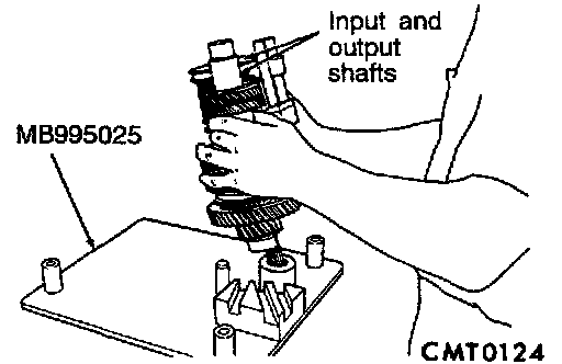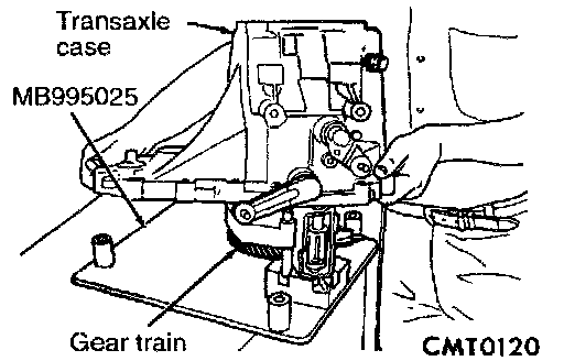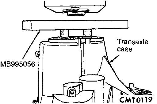 14. Install bearing fixture (MB995056) onto transaxle end bearings. Verify tool is properly aligned to input and output shaft.