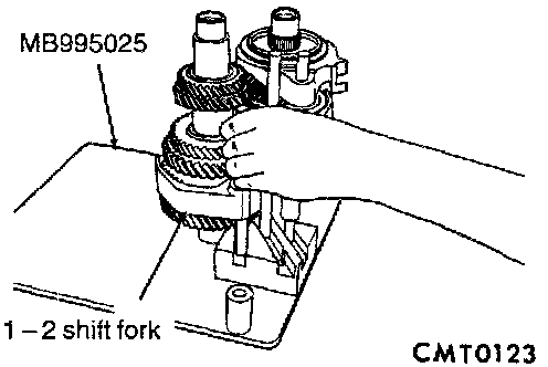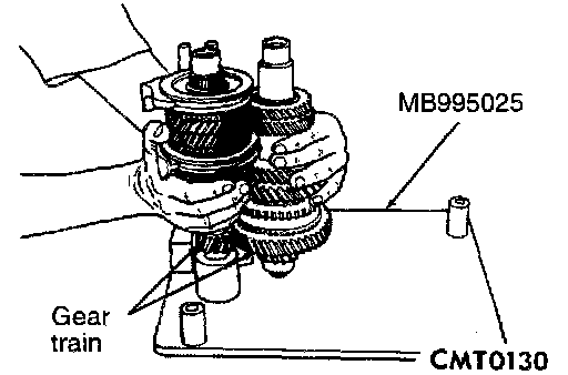 1. Verify bench fixture shims are removed from bench fixture. Install output and input gear into pallet fixture (MB995025).