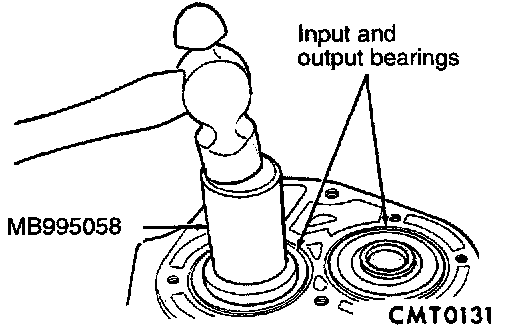 6. Position input and output bearings on the shafts. Using MB995058, press input and output shaft bearings until they bottom into the case and against the shafts.