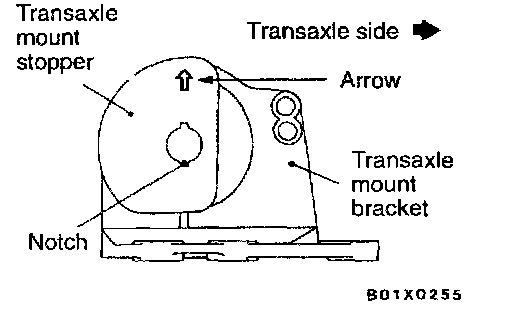 Align the notches on the stopper with the transaxle mount bracket with the arrow mark facing toward the shown direction. Then install the stopper.