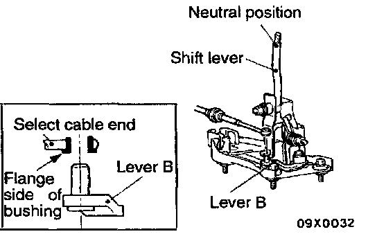 1. While leaving the shift lever inside the passenger compartment in the neutral position, install the shift cable to the passenger compartment side of the shift lever. Install so that the slit section of the bushing B is facing either up or down.