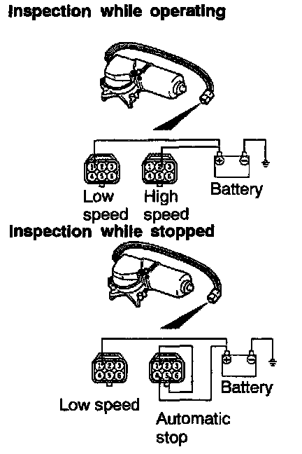 Connect a battery to the wiper motor as shown in the illustration and inspect motor operation at low speed and high speed.
