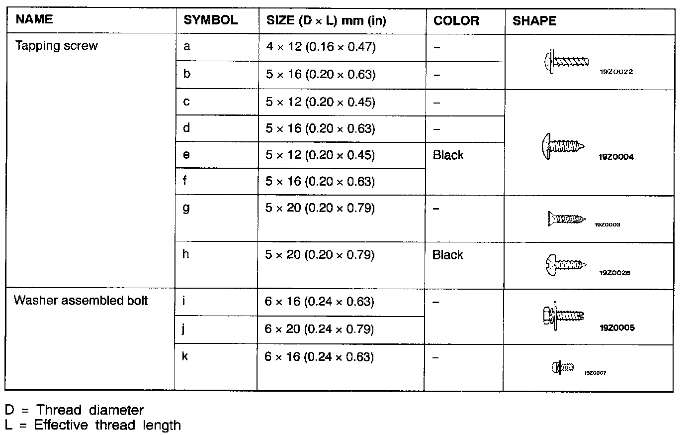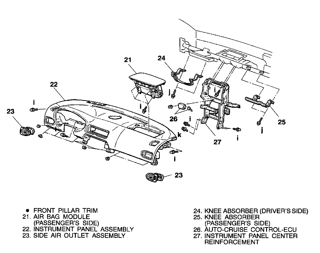 The bolts and screws described are used for installation of the instrument panel. They are indicated by symbols in the illustration.