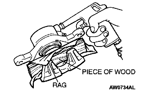Place a piece of wood, etc. against the caliper body as shown. Blow compressed air through the brake hose to remove the piston boot and piston.
