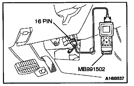 CAUTION: To prevent damage to scan tool MB991502, always turn the ignition switch to "LOCK" (OFF) position before connecting or disconnecting scan tool MB991502.