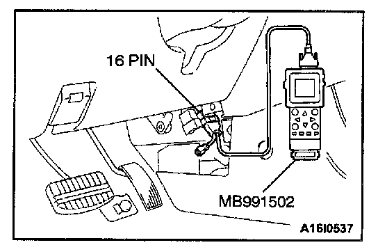 CAUTION: To prevent damage to scan tool MB991502, always turn the ignition switch to "LOCK" (OFF) position before connecting or disconnecting scan tool MB991502.