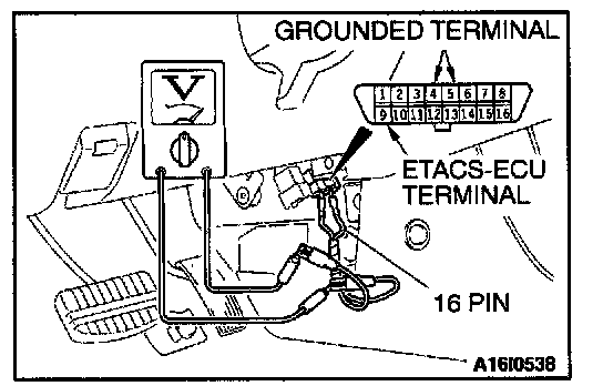 1. Use special tool MB991529 to connect a voltmeter between ground terminal 4 or 5 and ETACS-ECU terminal 9 of the data link connector.