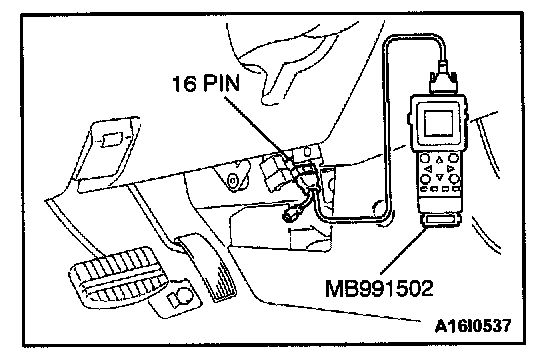 CAUTION: To prevent damage to scan tool MB991502, always turn the ignition switch to "LOCK" (OFF) position before connecting or disconnecting scan tool M6991502.