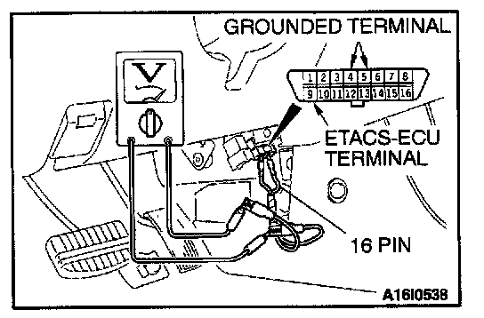 1. Use special tool MB991529 to connect a voltmeter between ground terminal 4 or 5 and ETACS-ECU terminal 9 of the data link connector.
