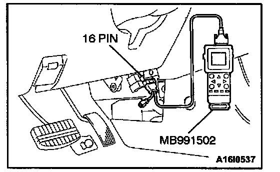 CAUTION: To prevent damage to scan tool MB991502, always turn the ignition switch to "LOCK" (OFF) position before connecting or disconnecting scan tool MB991502.