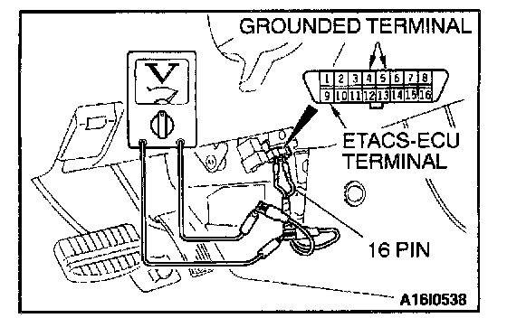 1. Use special tool MB991529 to connect a voltmeter between ground terminal 4 or 5 and ETACS-ECU terminal 9 of the data link connector.