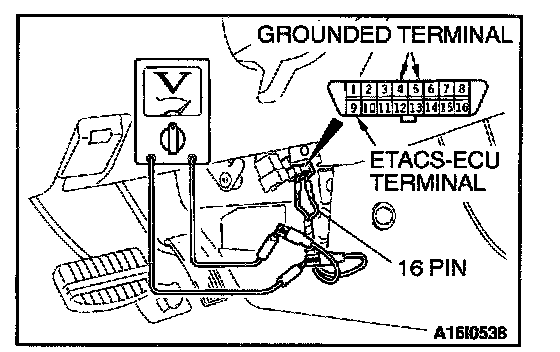 1. Use special tool MB991529 to connect a voltmeter between ground terminal 4 or 5 and ETACS-ECU terminal 9 of the data link connector.