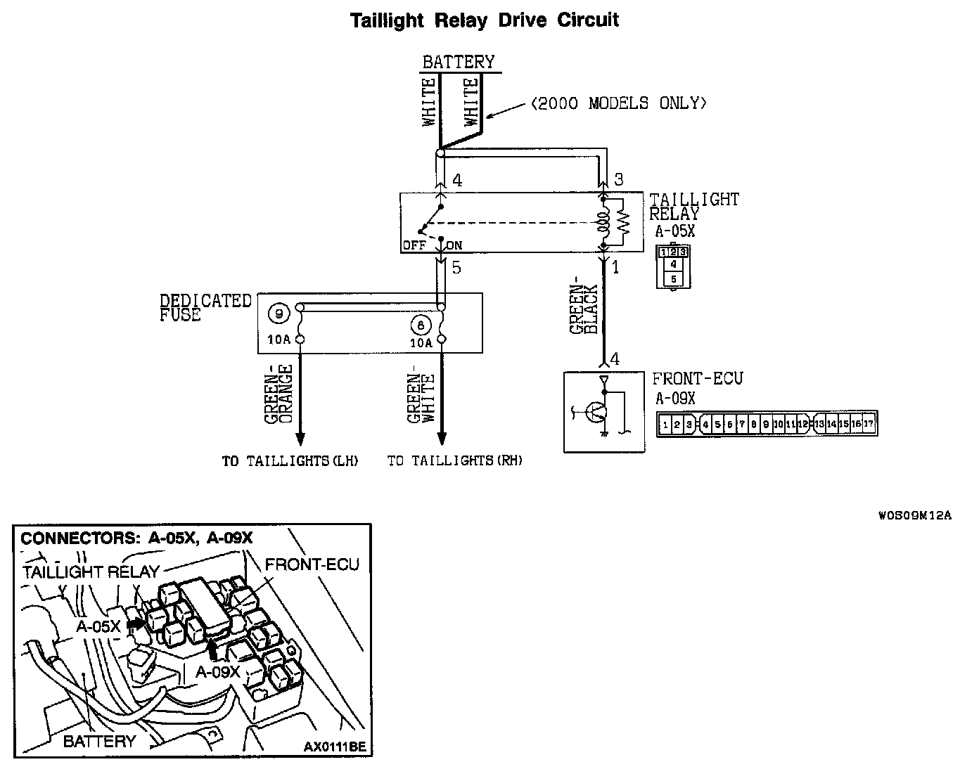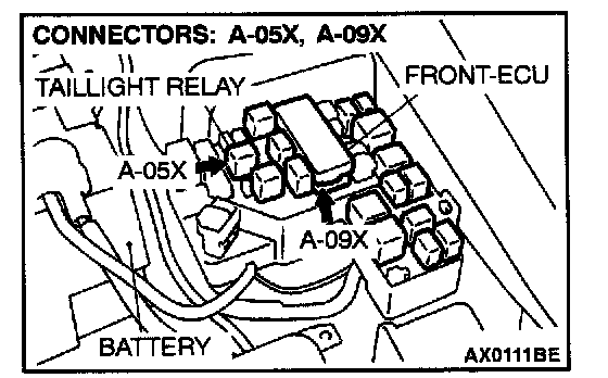 STEP 7. Check the taillight relay connector A-05X and front-ECU connector A-09X for damage.
