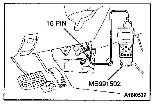 CAUTION: To prevent damage to scan tool MB991502, always turn the ignition switch to "LOCK" (OFF) position before connecting or disconnecting scan tool MB991502.