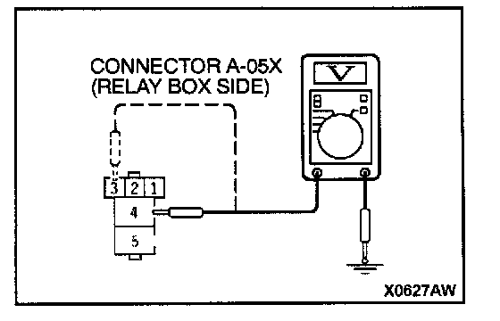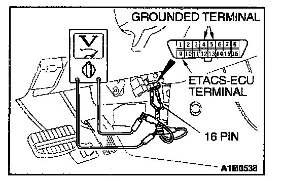 1. Use special tool MB991529 to connect a voltmeter between ground terminal 4 or 5 and ETACS-ECU terminal 9 of the data link connector.