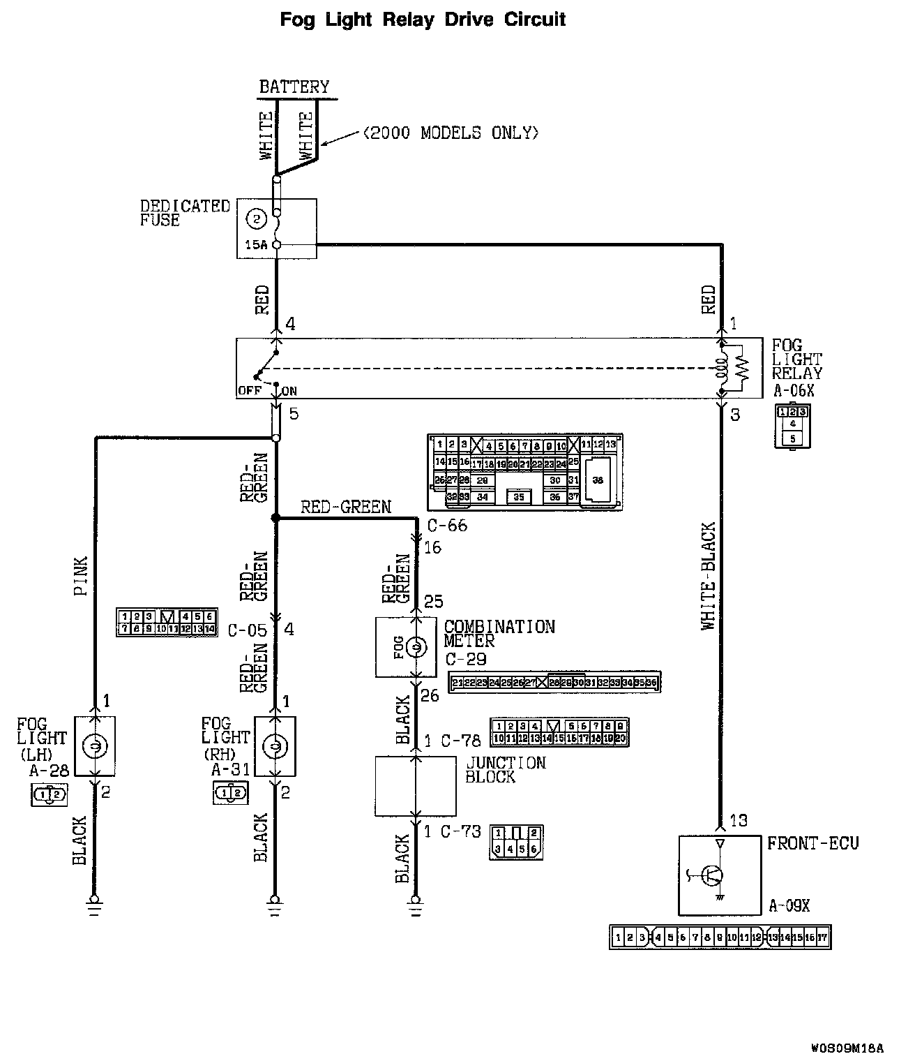 If the harness wire between fog light relay connector A-06X and front-ECU connector A-09X is damaged, repair it.