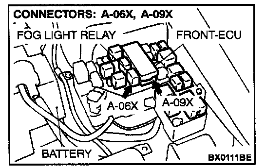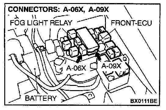STEP 7. Check the fog light relay connector A-06X and front-ECU connector A-09X for damage.