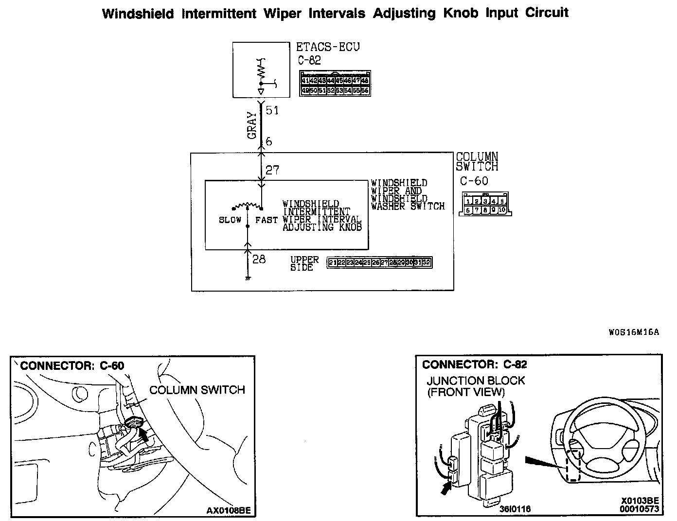 If the harness wire between column switch connector C-60 and ETACS-ECU connector C-82 is damaged, repair it. Check that the input signal from the windshield intermittent wiper interval adjusting knob can be checked and the wiper interval can be adjusted.