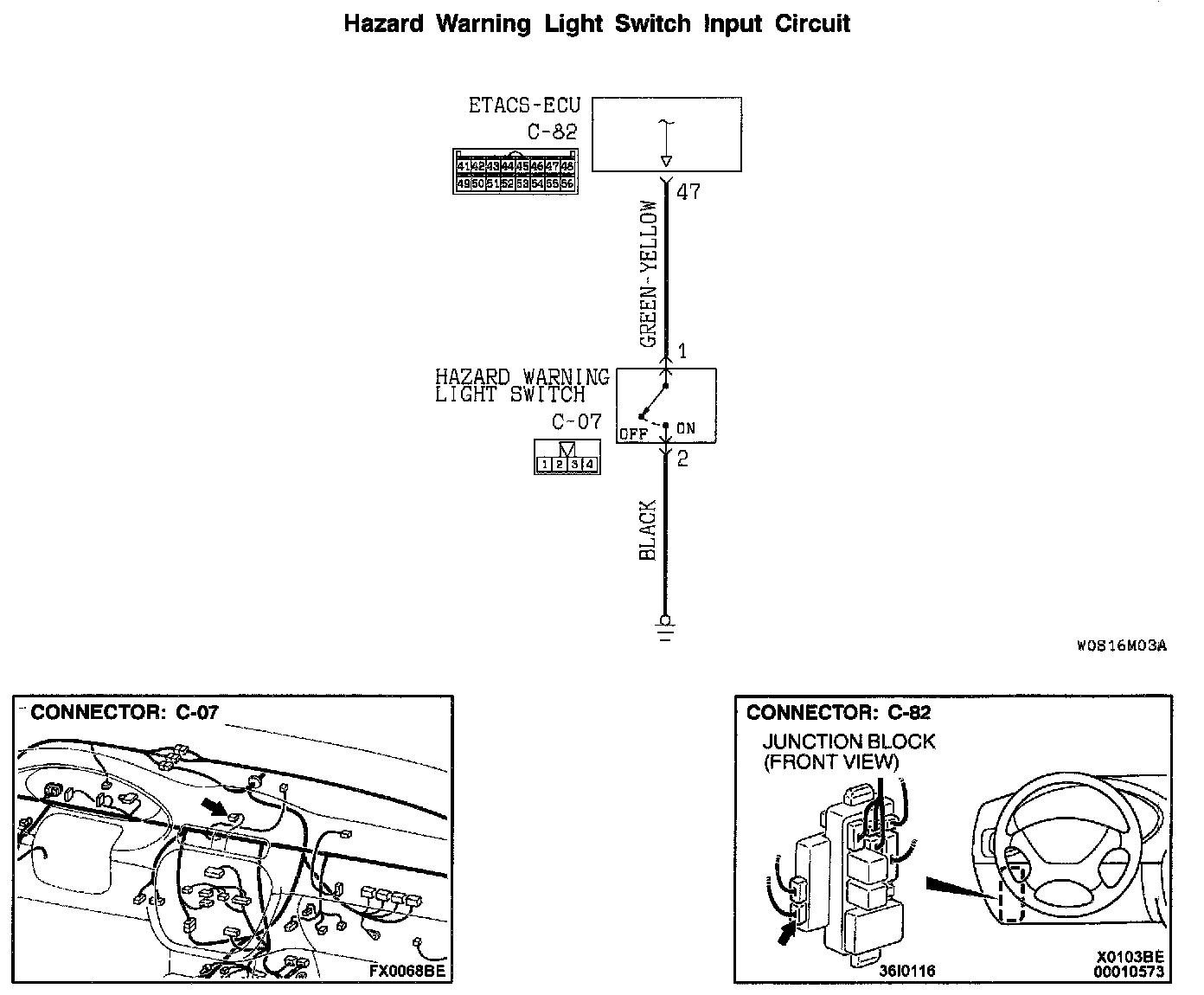 If the harness wire between hazard warning light switch connector C-07 and ETACS-ECU connector C-82 is damaged, repair it.