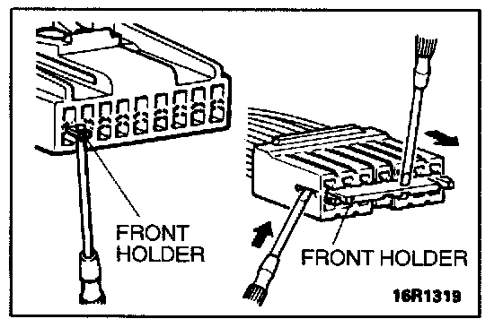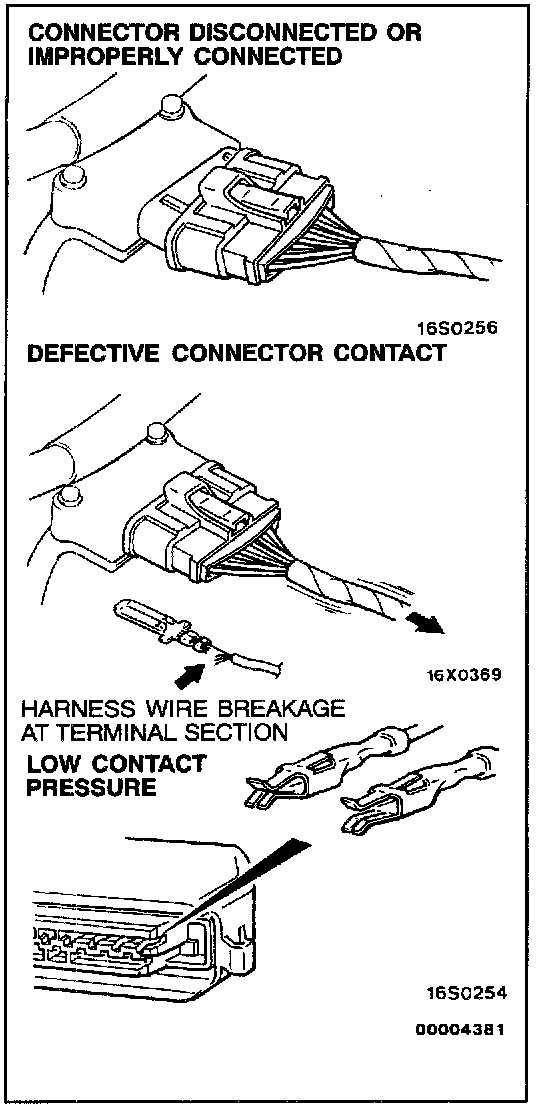 The inspection harness for connector pin contact pressure should be used. The test probe should never be forcibly inserted, as it may cause a defective contact.