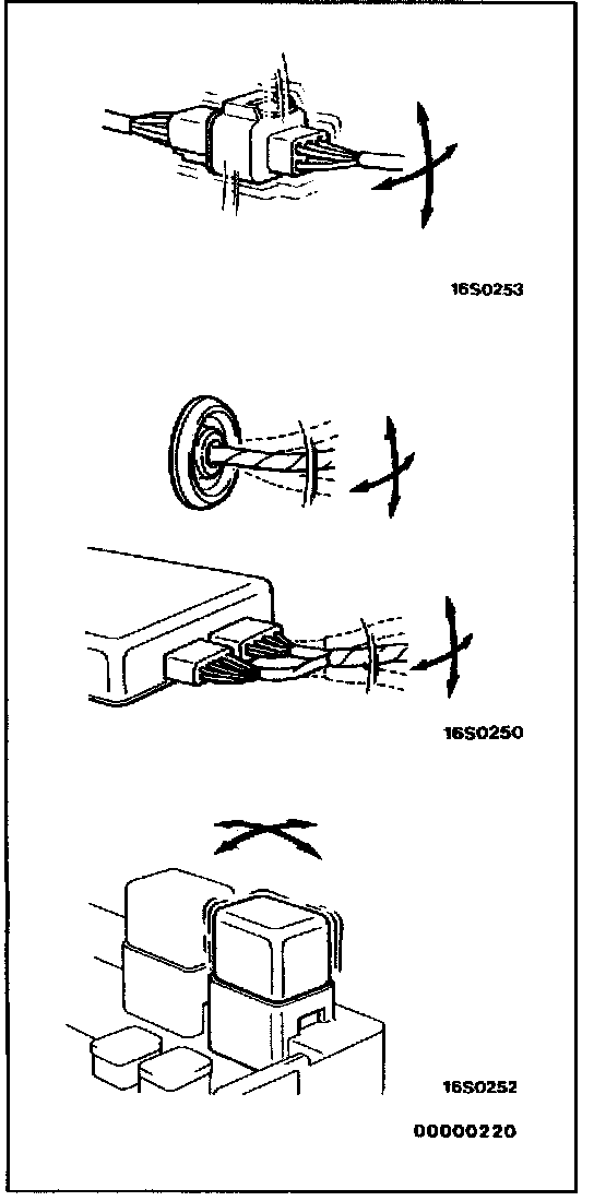 If the connector pin stopper is damaged, the terminal connections (male and female pins) will not be perfect even when the connector body is connected, because the pins may pull out of the back side of the connector. Therefore, gently pull the wires one by one to make sure that no pins pull out of the connector.
