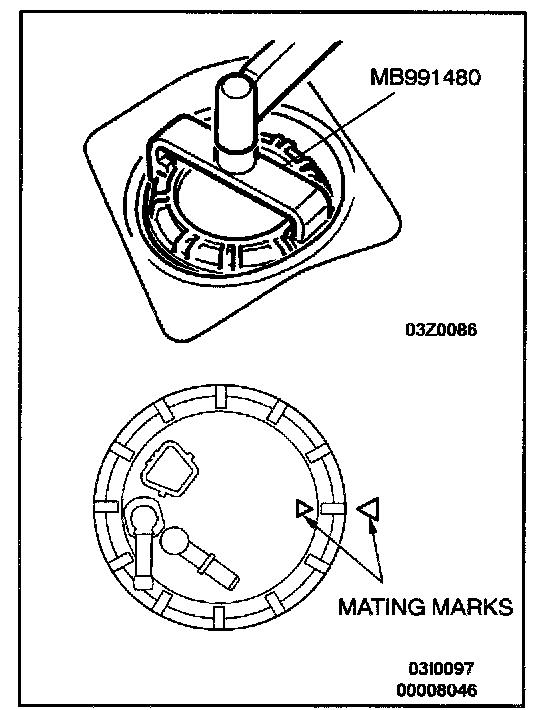 7. Use the special tool MB991480 to align the mating marks on the fuel tank and fuel pump module, and tighten the cap.