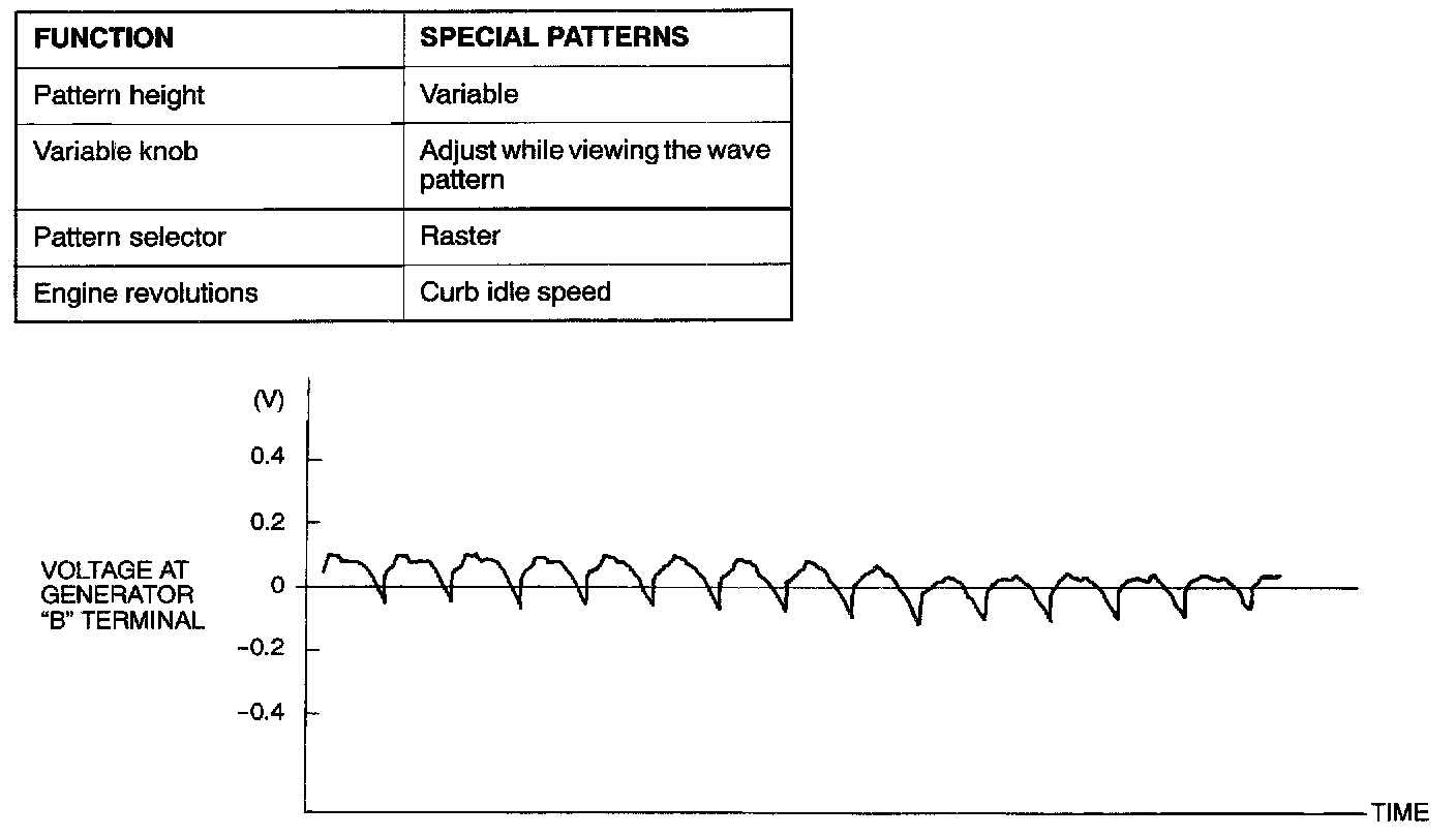 NOTE: The voltage waveform of the generator "B" terminal can undulate as shown at left. This waveform is produced when the regulator operates according to fluctuations in the generator load (current), and is normal for the generator. If the ripple height is abnormally high (approximately 2 V or more during idling), the wires between the generator B terminal and the battery have broken due to fuse blowing, etc. The generator is usually operating properly