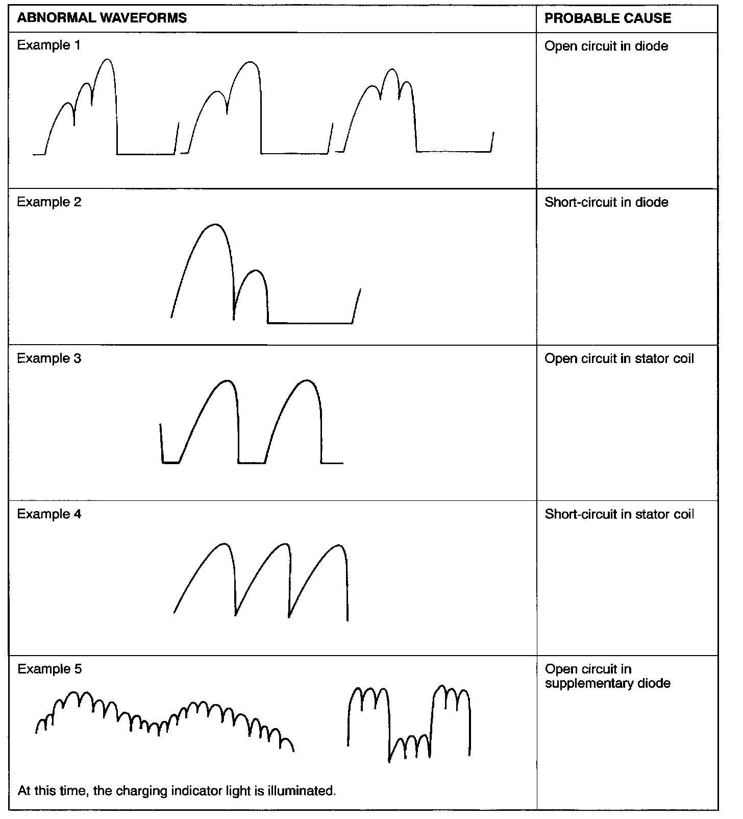 NOTE: Identification of abnormal waveforms is easier when there is a large output current (regulator is not operating) (Waveforms can be observed when the headlights are illuminated.)